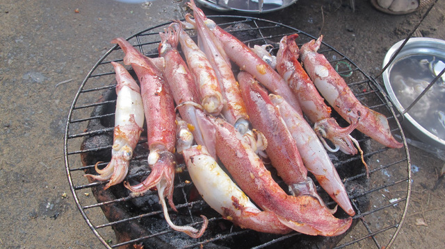 Cách đơn giản là dùng ngay tại chỗ, câu mực được con nào nướng luôn con ấy trên tán đèn măng sông. Mực nhảy mới được câu lên, bắc bếp than hoa đỏ rực, đặt con mực lên vỉ nướng, vị mặn của biển hòa quyện cùng mùi thơm của mực, thật tuyệt vời. Con mực tươi rói nướng lên vừa thơm giòn vừa ngọt, chấm với tương ớt cùng muối tiêu pha chanh, sẽ cảm nhận được độ tươi ngọt, thịt mực vừa giòn vừa dai, nên có thể ăn no mà không ngán.